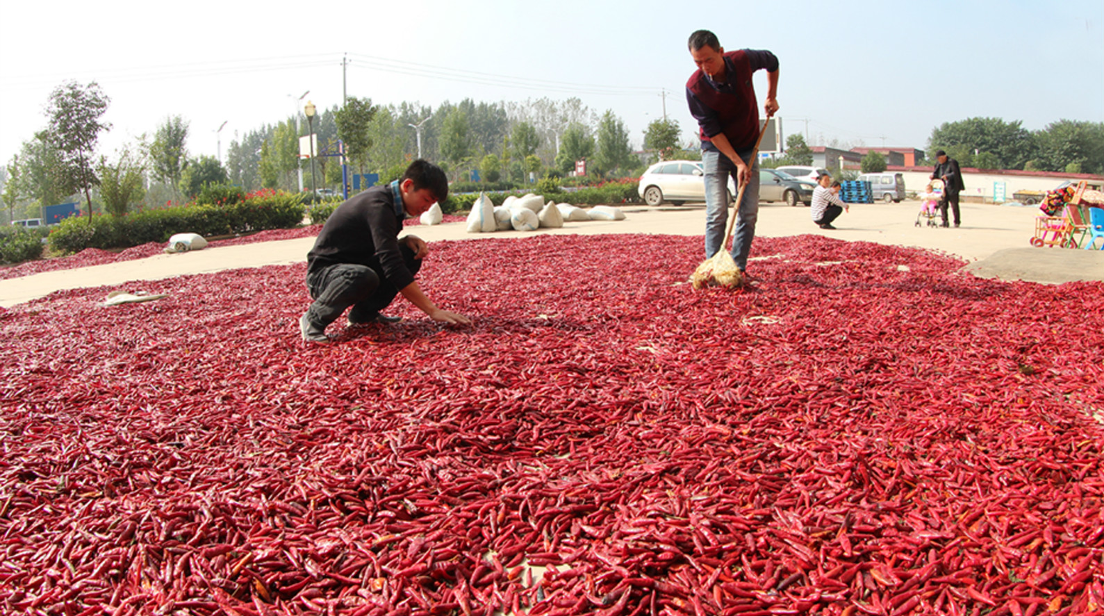 10月19日上午,邢庄乡七里头村民正在摊晒采摘下来的辣椒。近年来,辣椒种植已成为我县农民的重要增收产业,辣椒口感佳、天然色素高,深受各地客商欢迎。